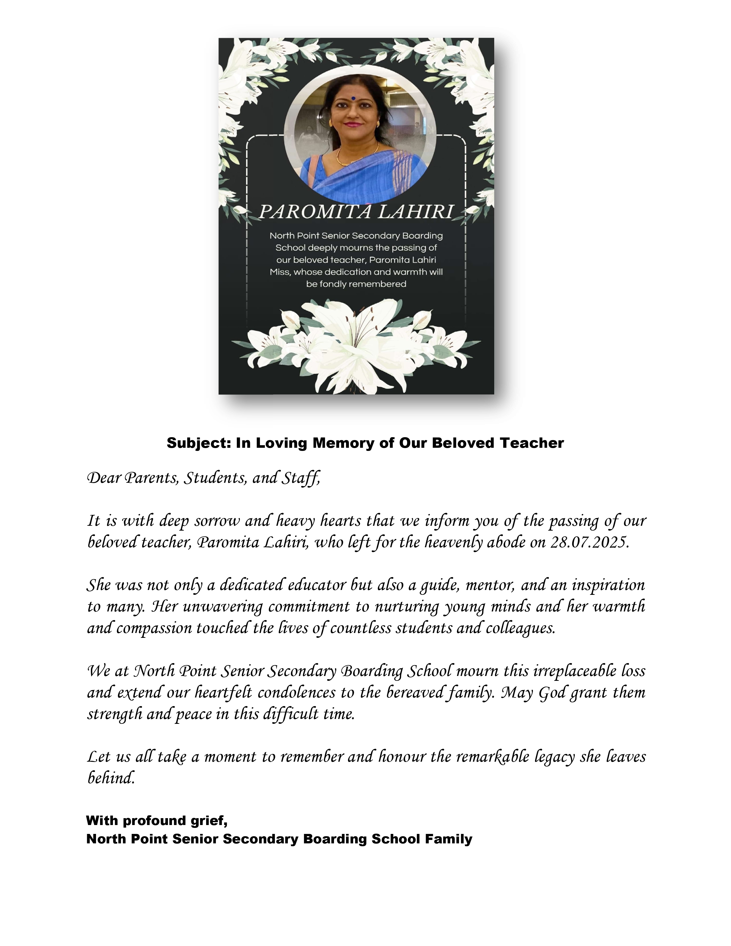 I am happy to be a part of the ‘North Point’ family and wish to introduce myself with a few thoughts pertaining to the preliminary idea of education that I have mentioned above. For a child this world is full of mysteries and magic and as educators we need to sustain that delightful enchantment. And gradually, by providing various tools and skills we just need to help them discover their own meanings and objectives of this enigmatic life. However, we often tread the wrong path and unfortunately crush the incredible lenses and force them to look through one single frame, bereft of colours and magic. We kill their imagination, we defeat their dreams and we turn them into little boxes, insipidly squared. I wish that we will, all together, pledge to nurture their creativity and open multiple windows into their minds to encourage drifting into the miraculous world of human existence. I believe that our teachers will be the Madhatters. And there will be a method to their madness. Let us remember that the child trusts us, therefore, let us keep our promises.