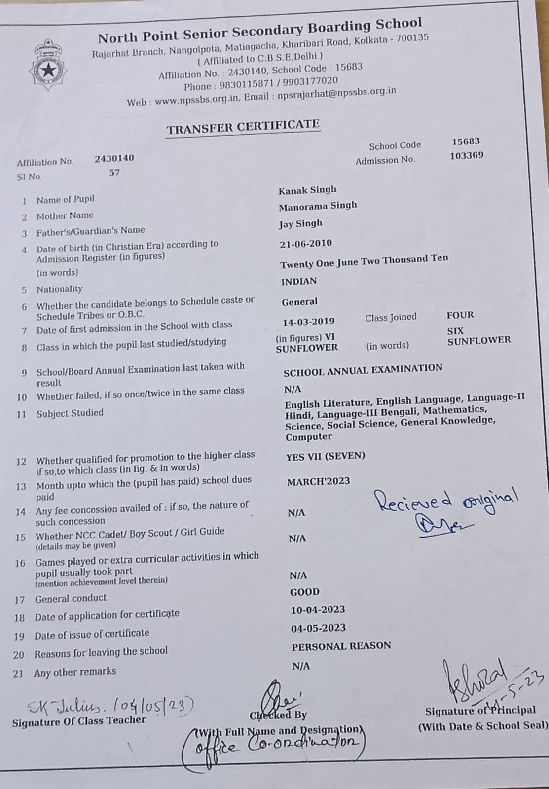 Transfer Certificate