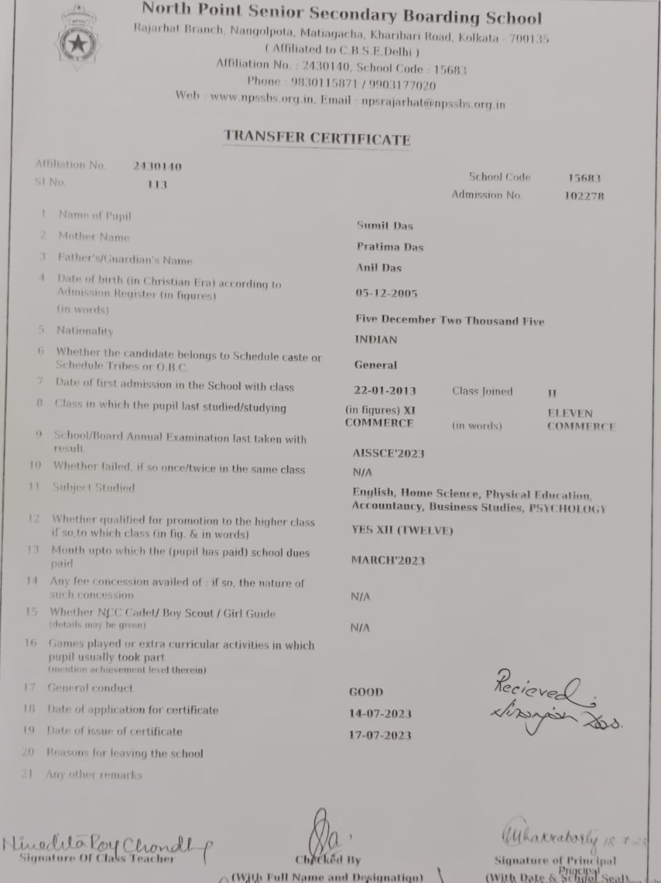 Transfer Certificate